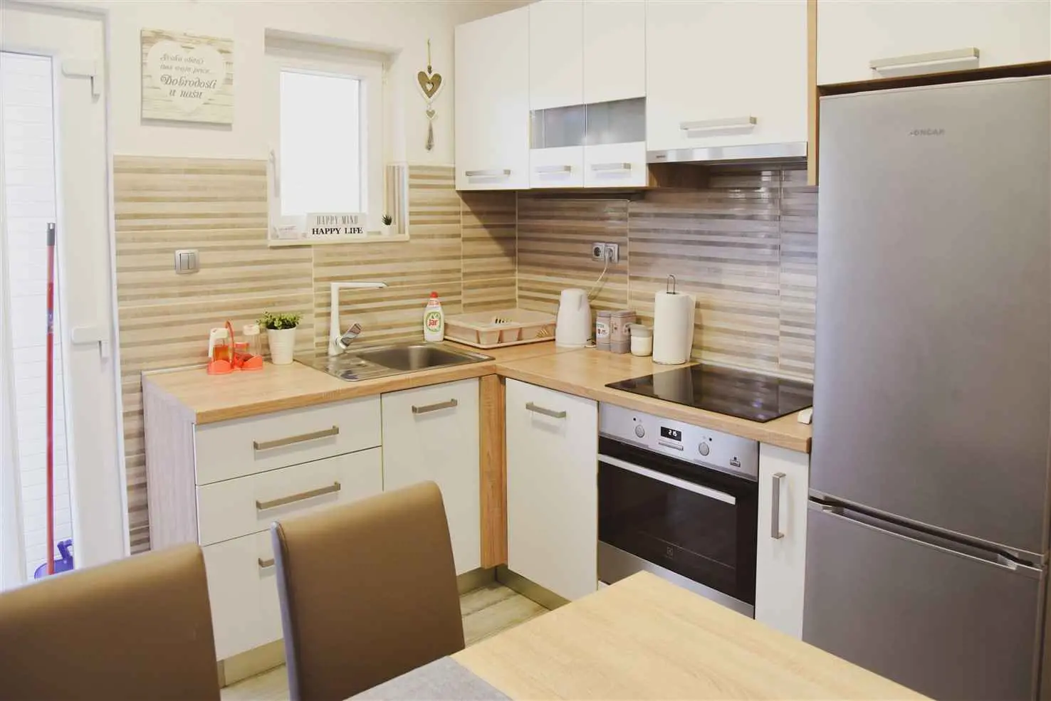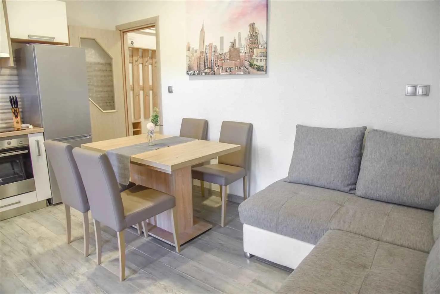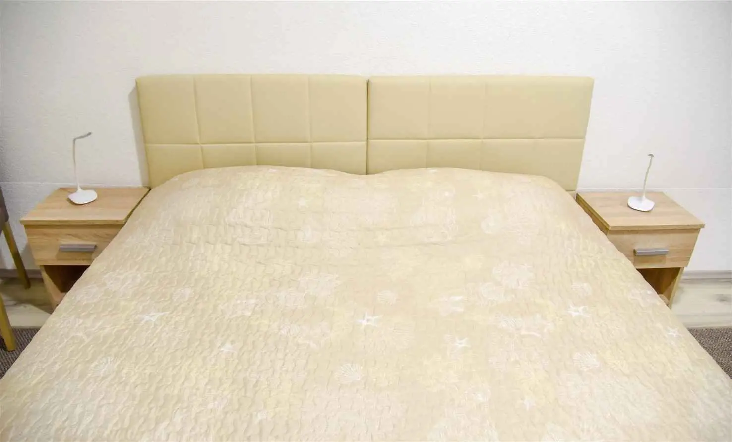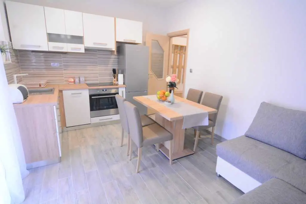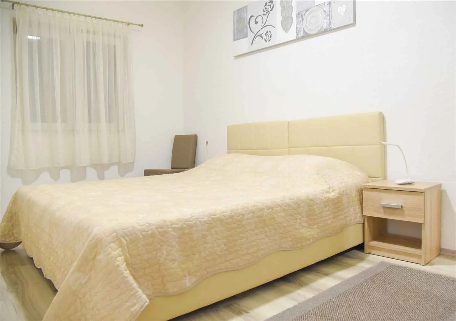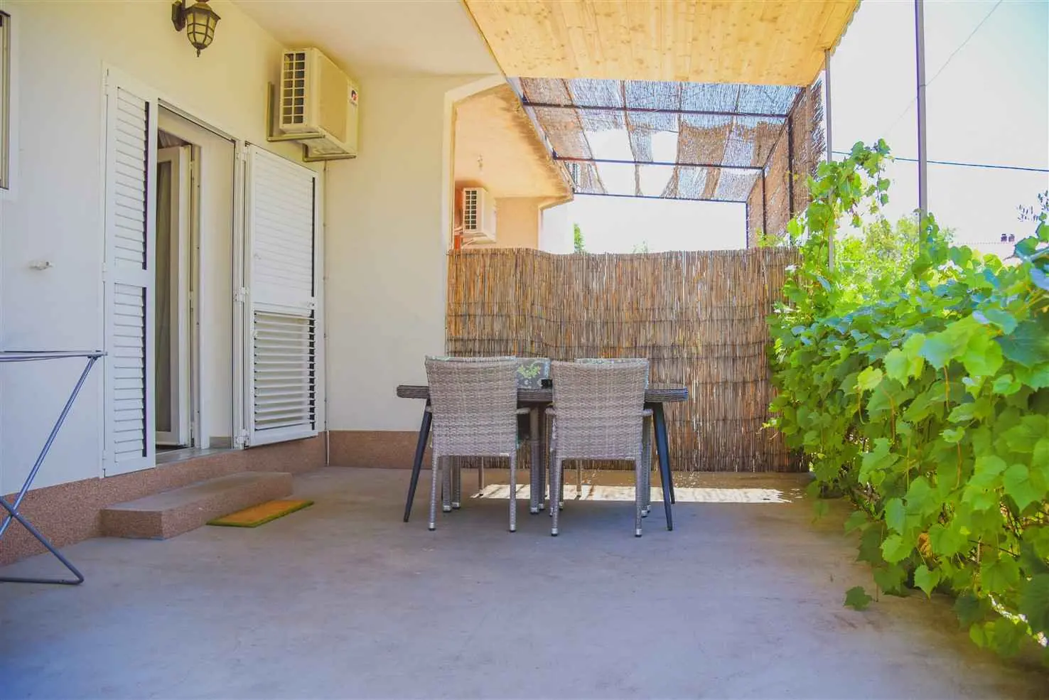 Tento klimatizovaný apartmán (35 m² + 18 m² terasy) je vybavený jednou spálňou pre dve osoby s oddelenými lôžkami, ktoré je možné spojiť do pohodlnej dvojlôžkovej postele, dobre vybavenej kuchyne s jedálenským stolom, umývačkou riadu, rúra a chladnička, obývačka s TV (satelit, inteligentná TV), kúpeľňa s práčkou a terasa s výhľadom do záhrady a gril. Byt je súkromný a má všetko, čo potrebujete na to, aby bol pobyt pohodlný, WIFI, KLIMATIZÁCIA PRE LETO A ZIMNU, PRÁČKY, MYČKY, TV, SMART TV. K dispozícii budete mať aj čisté uteráky, posteľ s čistou posteľnou bielizňou, toaletný papier, sprchový gél, šampón, sušič vlasov, plne vybavenú kuchyňu, žehliacu dosku a žehličku.