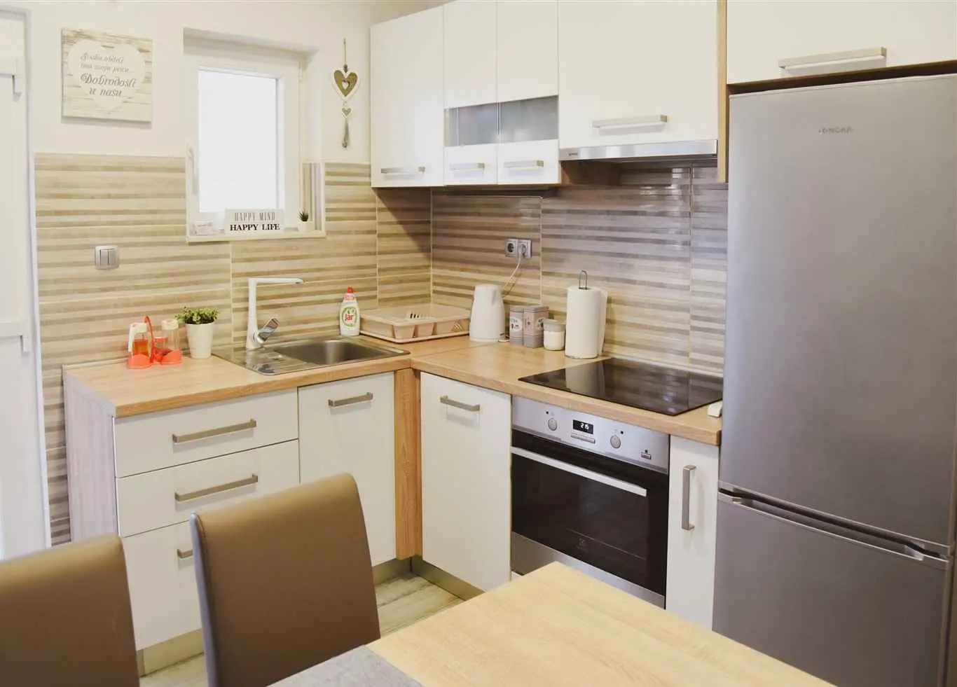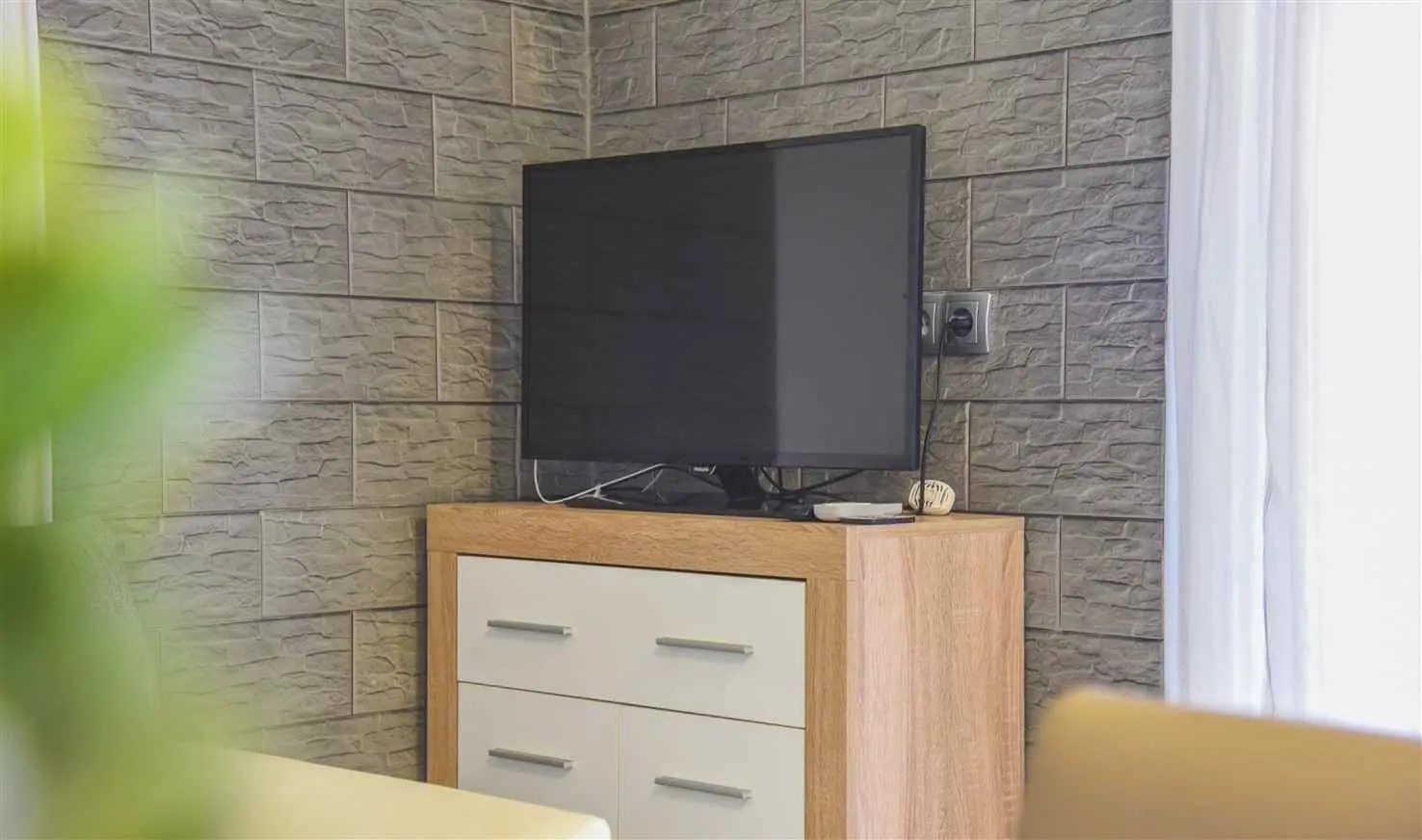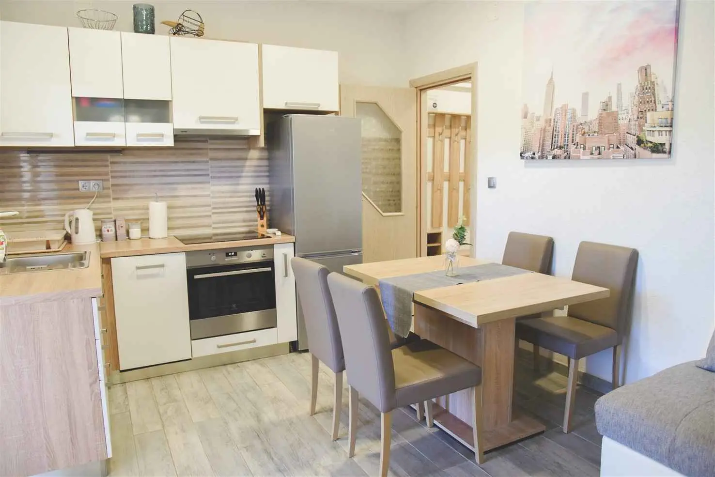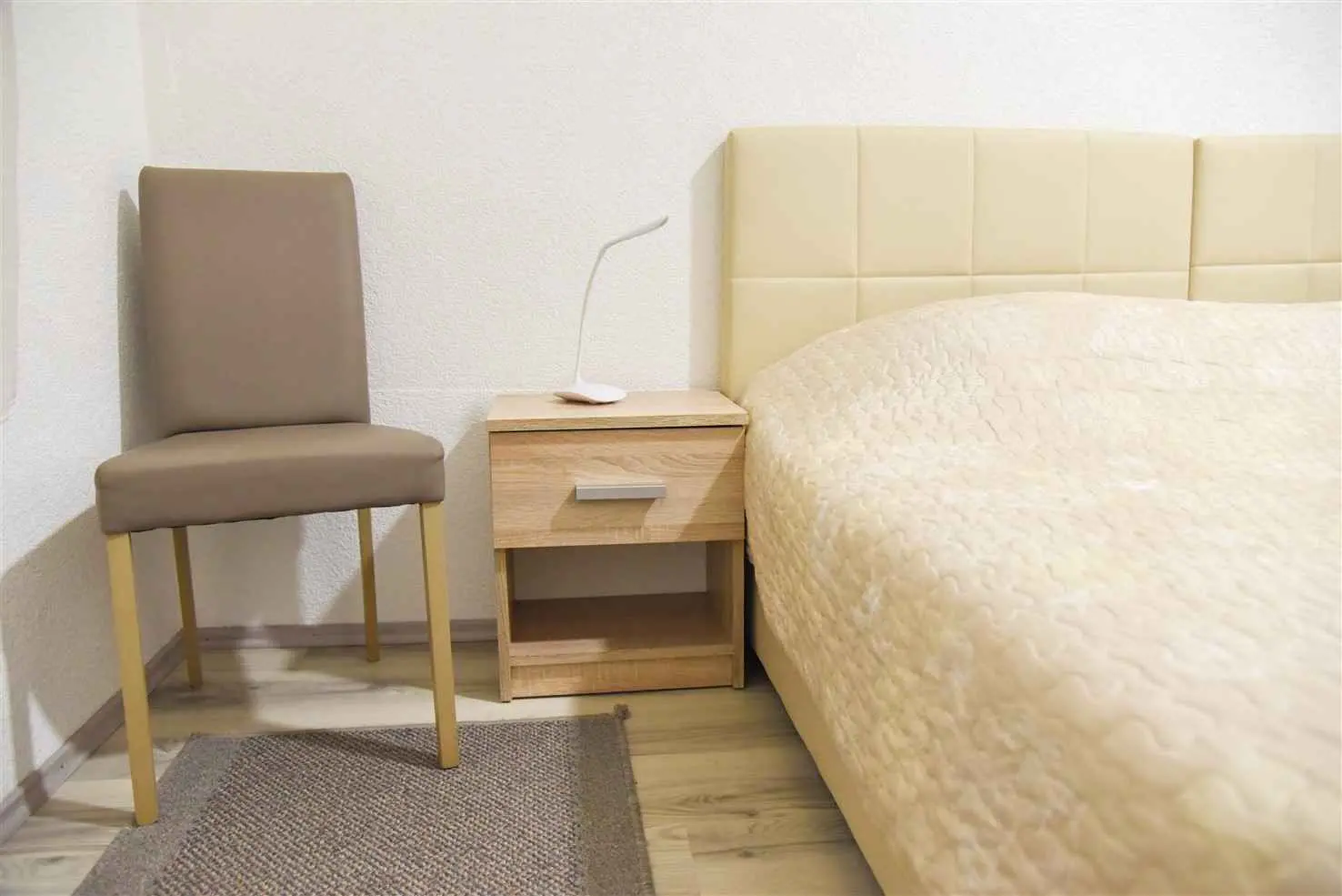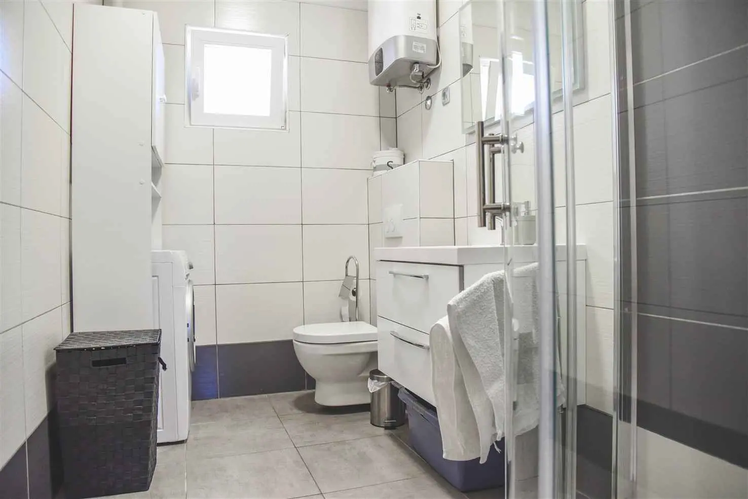 Tento klimatizovaný apartmán (35 m² + 18 m² terasy) je vybavený jednou spálňou pre dve osoby s oddelenými lôžkami, ktoré je možné spojiť do pohodlnej dvojlôžkovej postele, dobre vybavenej kuchyne s jedálenským stolom, umývačkou riadu, rúra a chladnička, obývačka s TV (satelit, inteligentná TV), kúpeľňa s práčkou a terasa s výhľadom do záhrady a gril. Byt je súkromný a má všetko, čo potrebujete na to, aby bol pobyt pohodlný, WIFI, KLIMATIZÁCIA PRE LETO A ZIMNU, PRÁČKY, MYČKY, TV, SMART TV. K dispozícii budete mať aj čisté uteráky, posteľ s čistou posteľnou bielizňou, toaletný papier, sprchový gél, šampón, sušič vlasov, plne vybavenú kuchyňu, žehliacu dosku a žehličku.