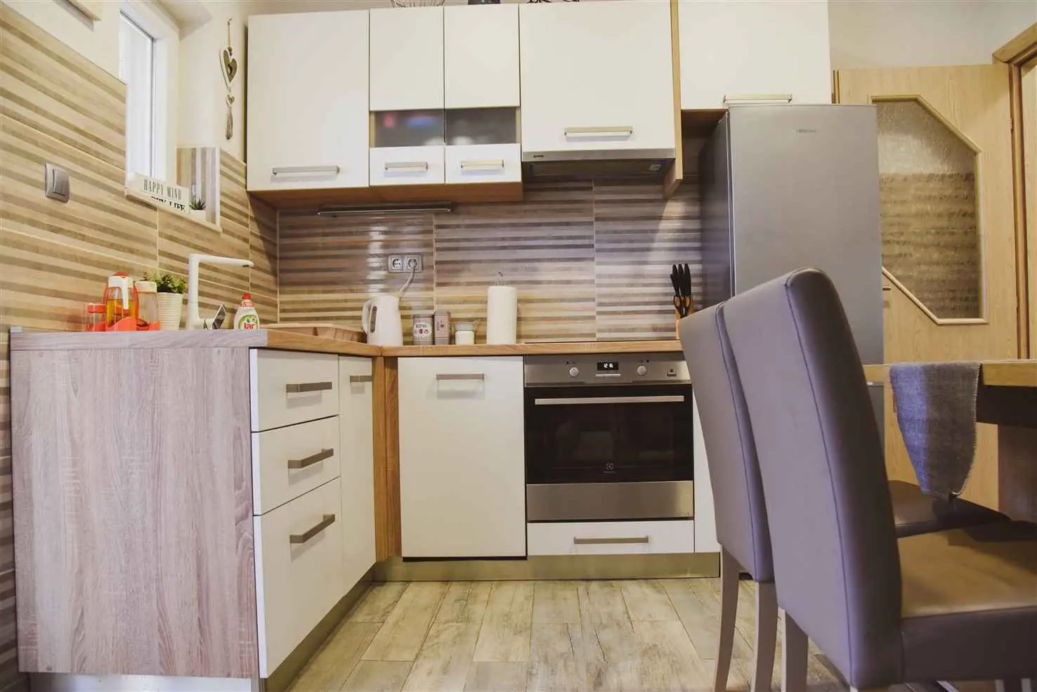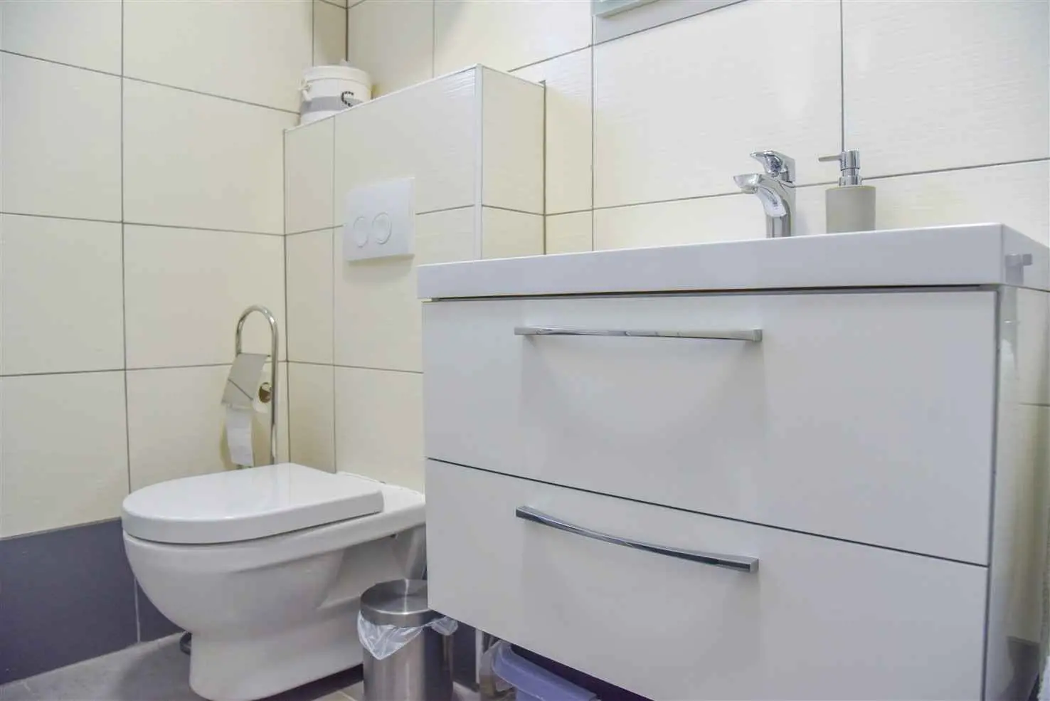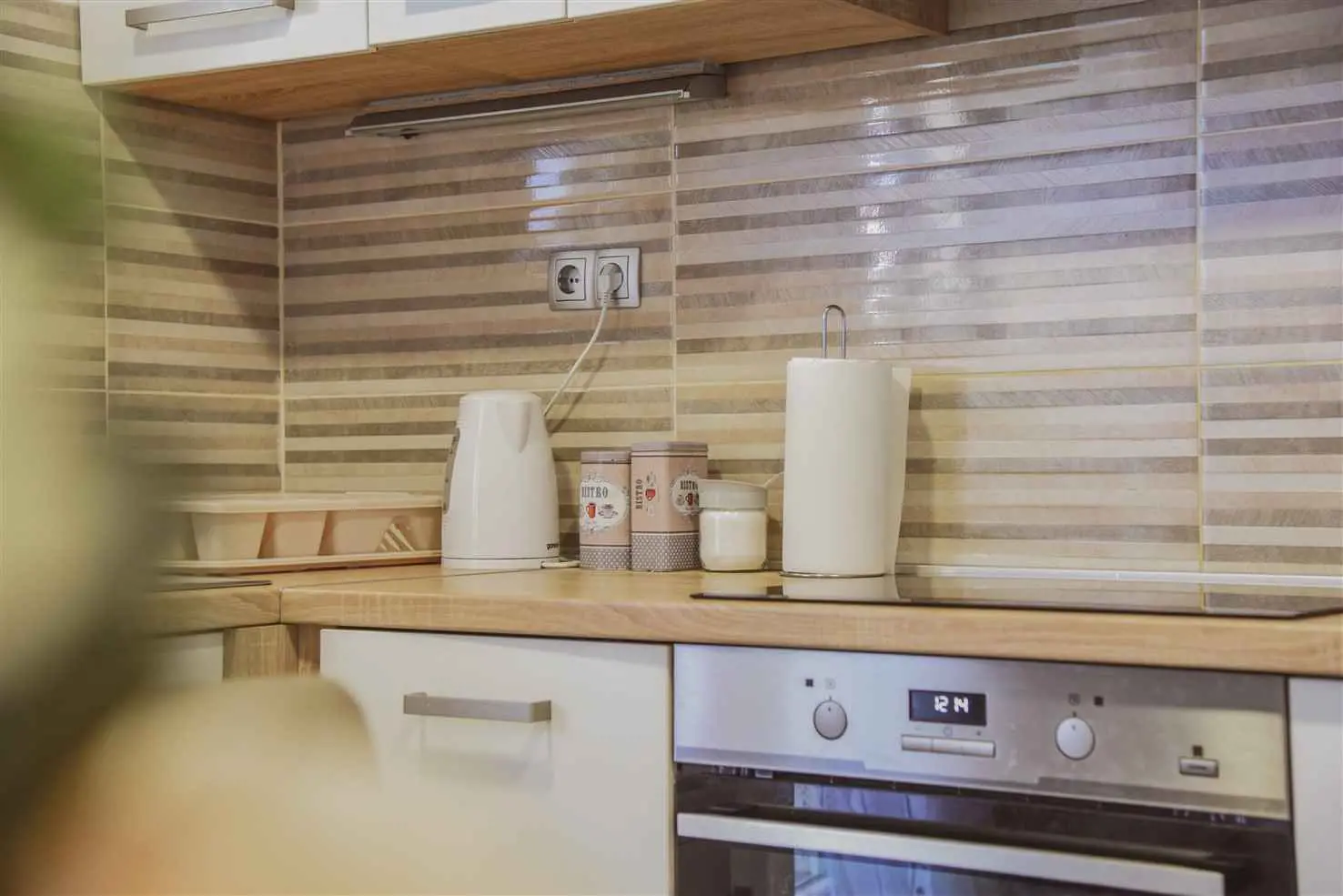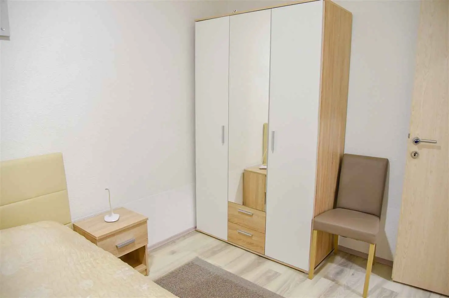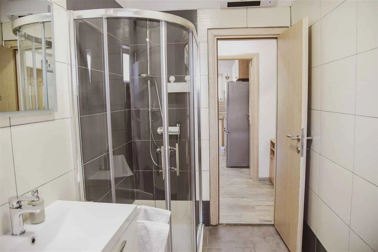 Tento klimatizovaný apartmán (35 m² + 18 m² terasy) je vybavený jednou spálňou pre dve osoby s oddelenými lôžkami, ktoré je možné spojiť do pohodlnej dvojlôžkovej postele, dobre vybavenej kuchyne s jedálenským stolom, umývačkou riadu, rúra a chladnička, obývačka s TV (satelit, inteligentná TV), kúpeľňa s práčkou a terasa s výhľadom do záhrady a gril. Byt je súkromný a má všetko, čo potrebujete na to, aby bol pobyt pohodlný, WIFI, KLIMATIZÁCIA PRE LETO A ZIMNU, PRÁČKY, MYČKY, TV, SMART TV. K dispozícii budete mať aj čisté uteráky, posteľ s čistou posteľnou bielizňou, toaletný papier, sprchový gél, šampón, sušič vlasov, plne vybavenú kuchyňu, žehliacu dosku a žehličku.