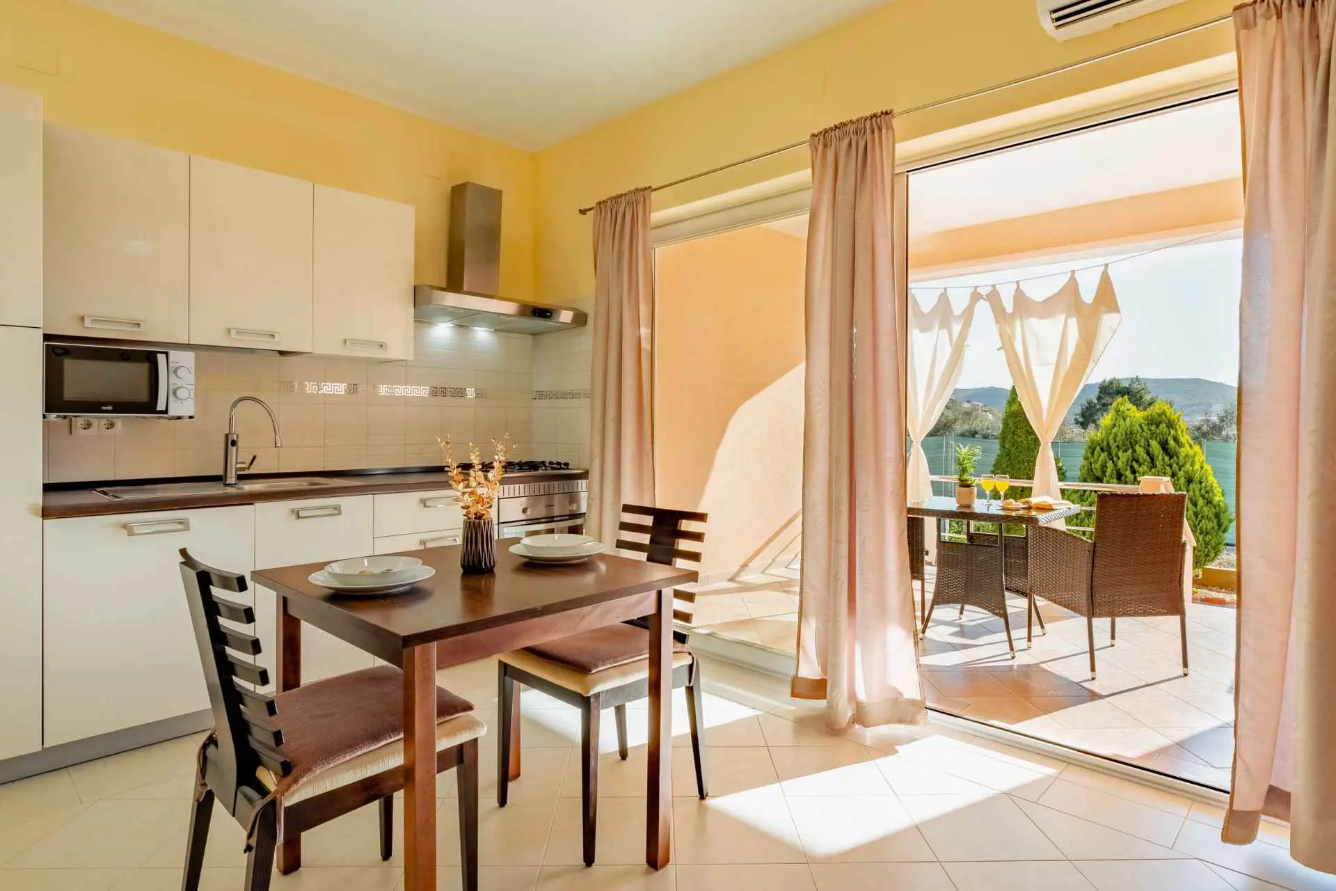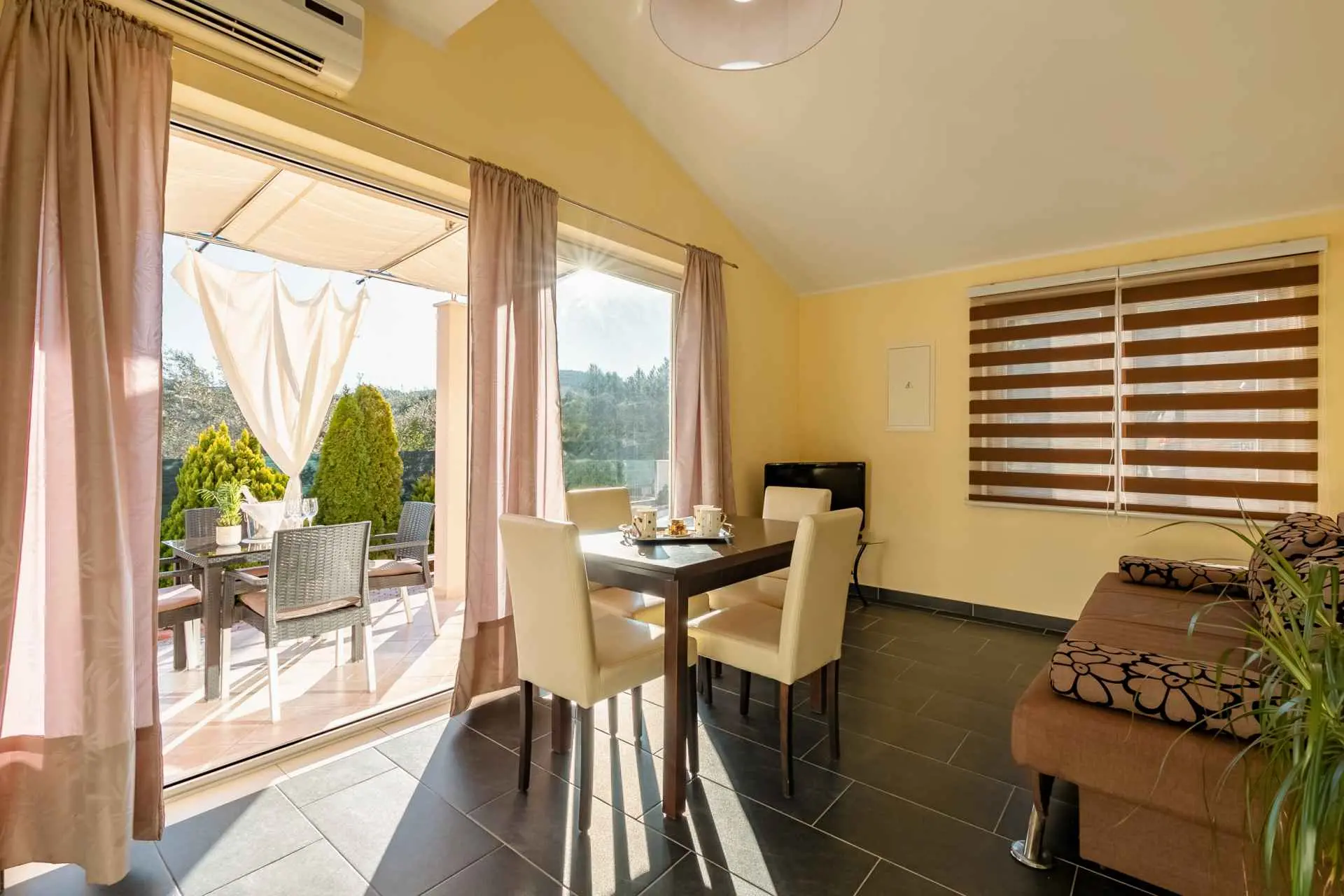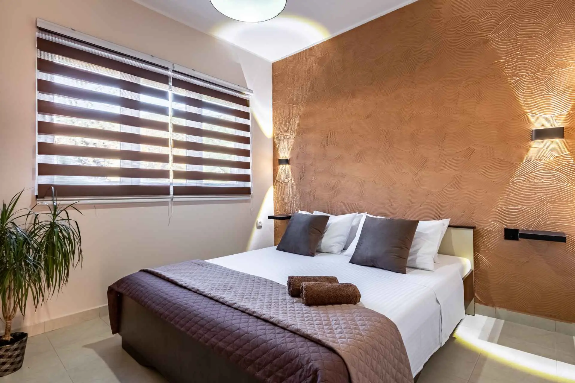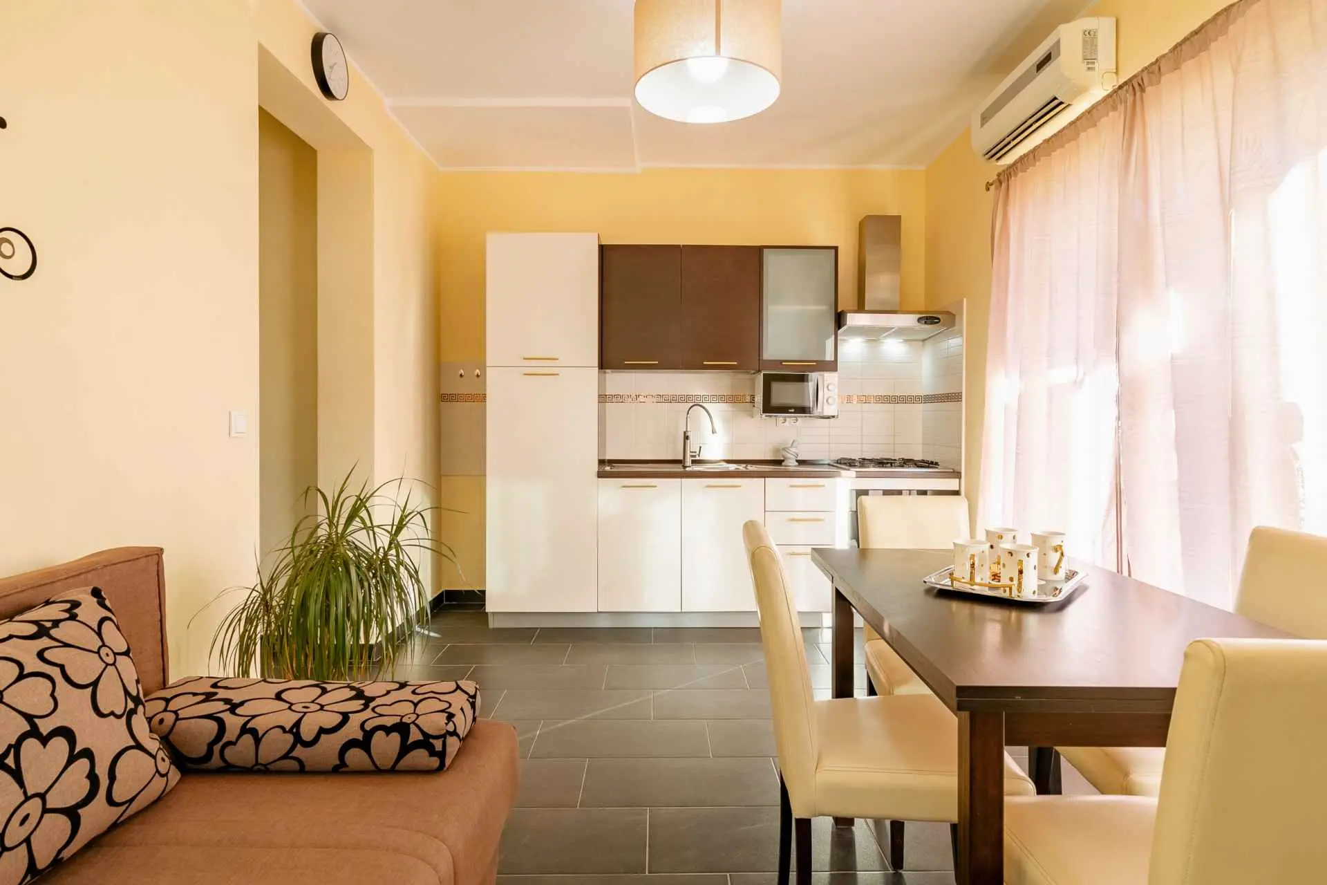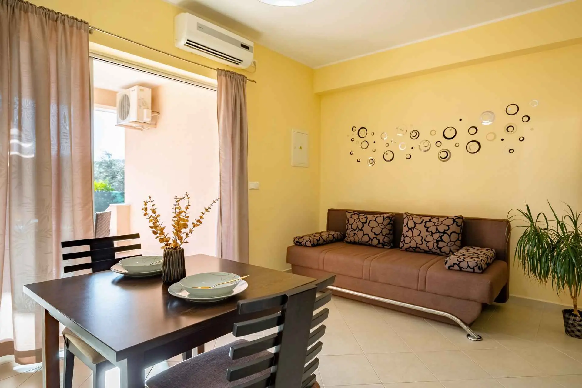 Tento úplne klimatizovaný apartmán o rozlohe 40 m² zaberá ľavú polovicu prízemia vily, ideálnym miestom pre relaxačnú dovolenku s rodinou alebo priateľmi ďaleko od davov turistov, ale v blízkosti všetkého komfortu mesta. Apartmán má svetlý a vzdušný obývací a jedálenský kút s integrovanou plne vybavenou kuchyňou, jednou spálňou a špičkovou modernou kúpeľňou. Obývací priestor je vybavený pohovkou, satelitnou televízorom s plochou obrazovkou s portom USB, rádiom a dreveným jedálenským stolom so štyrmi zodpovedajúcimi stoličkami. Vstavaná kuchyňa je vybavená štvorplatňovým plynovým sporákom, rúrou, štýlovým digestorom z nehrdzavejúcej ocele, veľkou chladničkou s mrazničkou, kávovarom, rýchlovarnou kanvicou a hriankovačom. Spálňa je vyzdobená v limetovo zelenej farebnej schéme, ktorá poskytuje relaxačné a veselé prostredie. Je vybavený manželskou posteľou 160 cm x 200 cm a šatníkom, ktorý poskytuje dostatok úložného priestoru pre vaše oblečenie a batožinu. Pohovka v obývacej izbe je možné premeniť na ďalšie dvojlôžko 160 cm x 200 cm, ktoré ponúka ďalšie miesto na spanie pre dve ďalšie osoby. Biele dlaždicové steny a čierna kachľová podlaha v kombinácii s prvotriednym príslušenstvom a príslušenstvom dávajú kúpeľňu kúpeľný pocit.