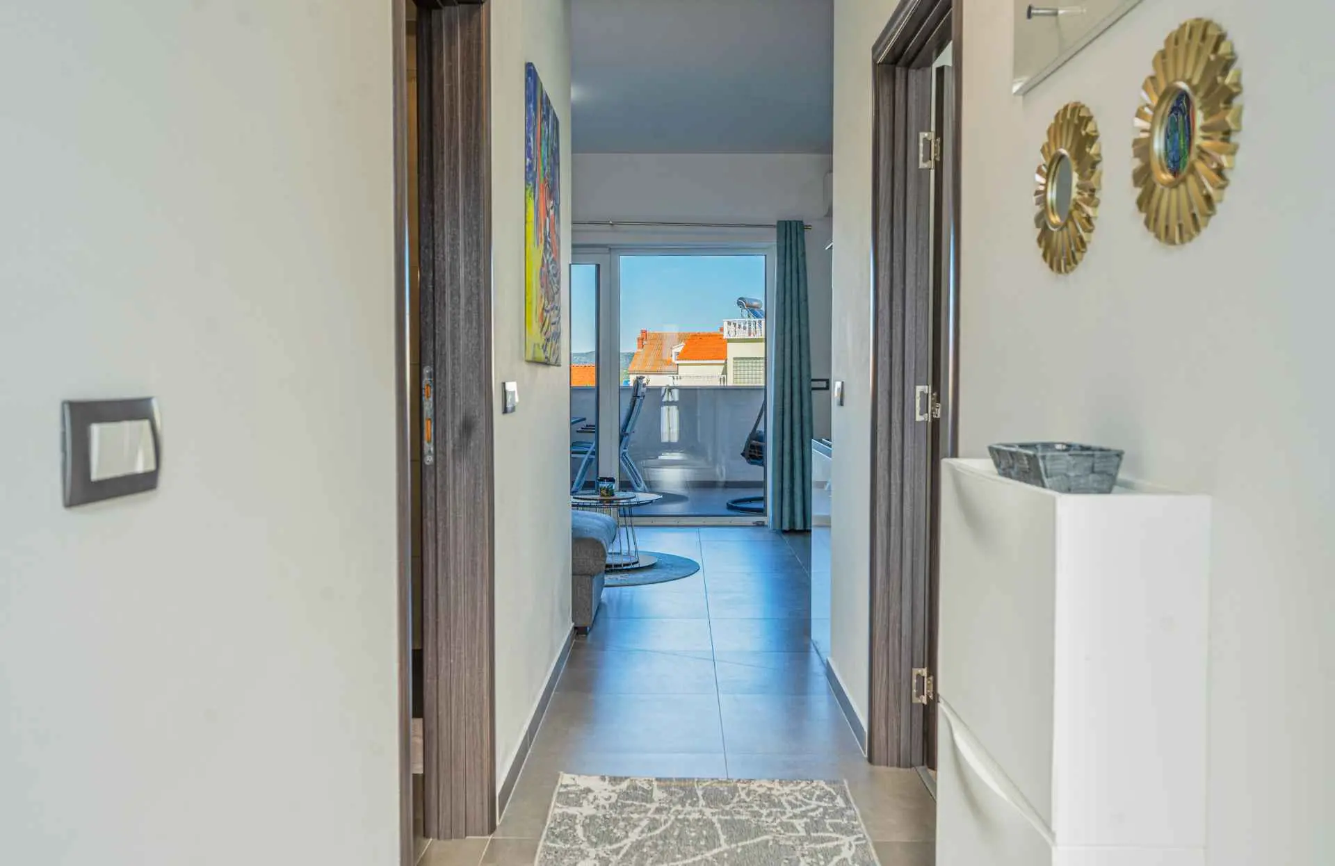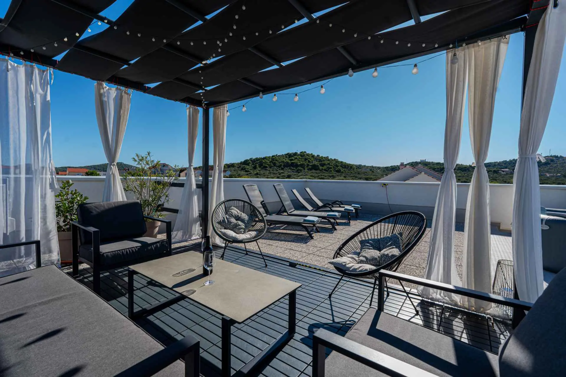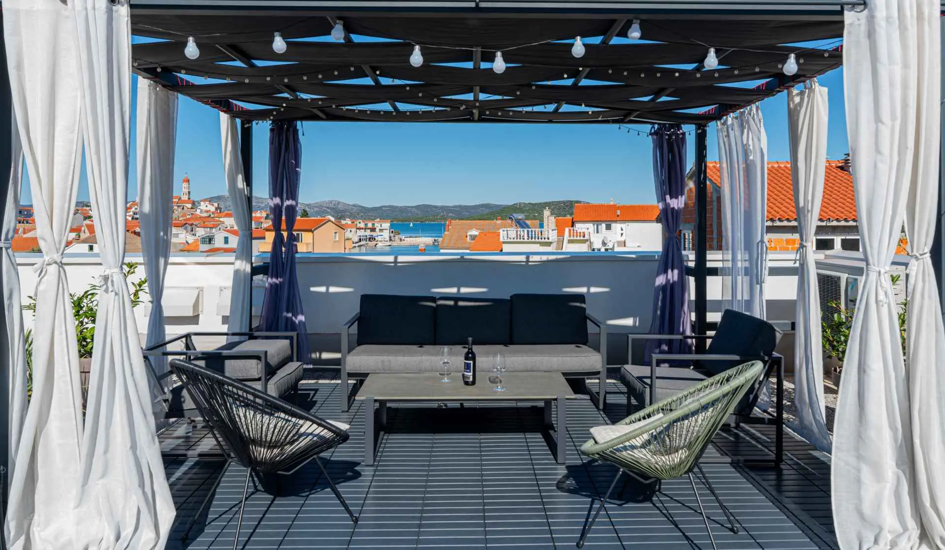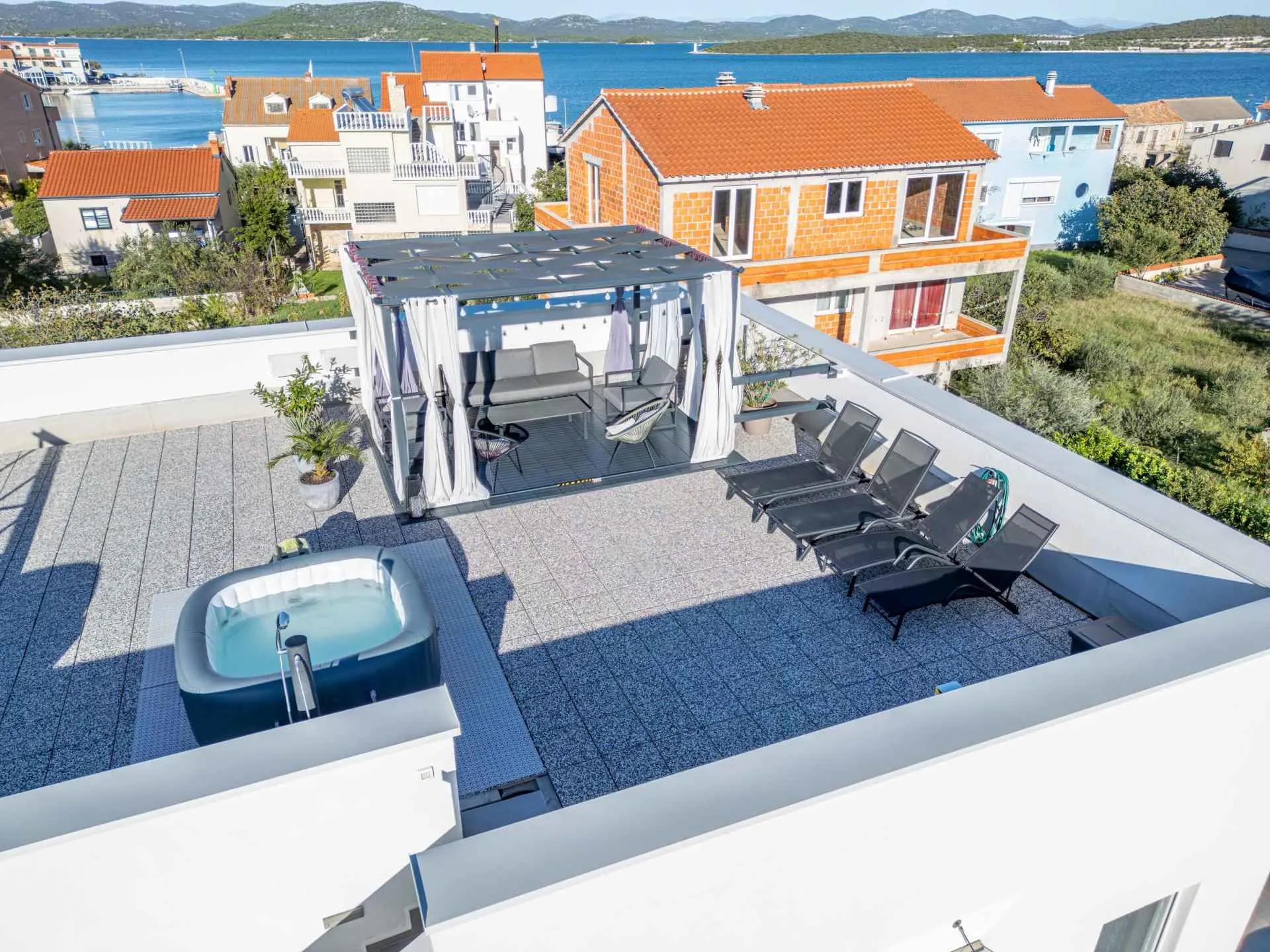 NOVINKA V PONUKE Na plochej streche vily je priestor na opaľovanie a jacuzzi. Hľadáte ideálne miesto pre pokojnú a relaxačnú dovolenku s rodinou? Nehľadaj ďalej! Ste fanúšikom aktívneho životného štýlu a adrenalínu? Aj vaše hľadanie sa skončilo! Na ostrove Murter, v malej malebnej rybárskej dedinke Betina, priamo pri mori, sa nachádza vila s dvoma luxusnými, moderne vybavenými a priestrannými apartmánmi s nádherným výhľadom! Luxusné apartmány hiža&vila (4*) ponúkajú ubytovanie vo výbornej lokalite v Betine na ostrove Murter, ktorý je s pevninou spojený zdvíhacím mostom. Sú moderne vybavené všetkým potrebným vybavením pre pohodovú dovolenku. Priestranné apartmány (A1 a A2) majú každý spálňu s posteľou 160x200 cm a obývaciu izbu s vysúvacou posteľou. Kuchyňa obsahuje umývačku riadu, rúru a mikrovlnku, indukčnú varnú dosku, digestor, chladničku s mrazničkou, kávovar, rýchlovarnú kanvicu, elektrický gril, hriankovač. Priestranná kúpeľňa so sprchovacím kútom. Apartmán 2 má aj ďalšie WC. Apartmány sa nachádzajú na prvom poschodí vily a sú vybavené klimatizáciou, Wi-Fi pripojením na internet a káblovou TV. Parkovacie miesta sú k dispozícii pri dome a sú zahrnuté v cene. Domáce zvieratá nie sú povolené. V každom prípade vila a Betina sú tou správnou voľbou. Na ostrove sú štyri osady: Murter, Betina, Jezera a Tisno, ktoré majú početné piesočnaté alebo kamienkové pláže! Nechajte sa rozmaznávať. Vitajte!