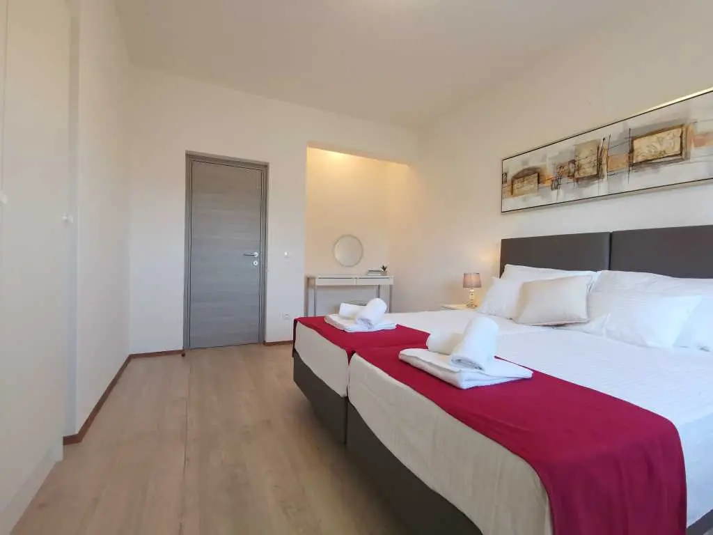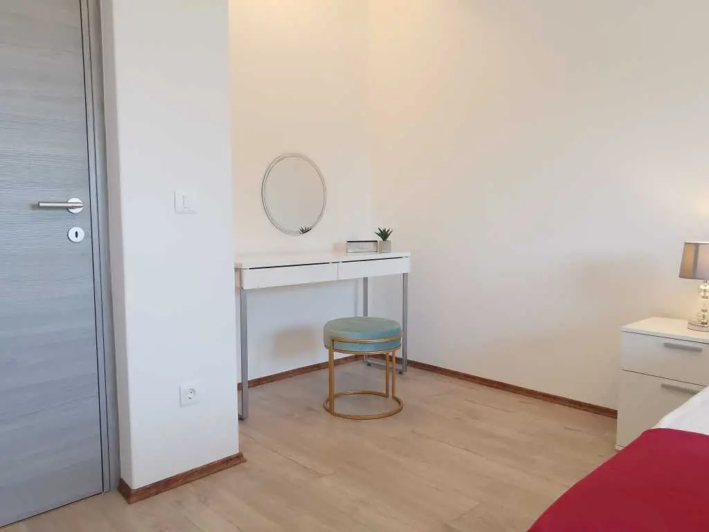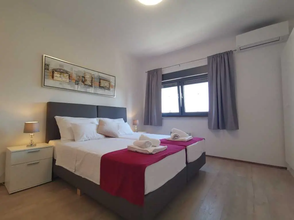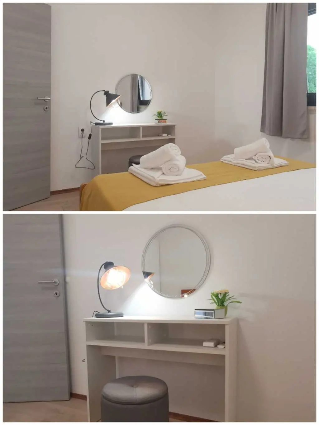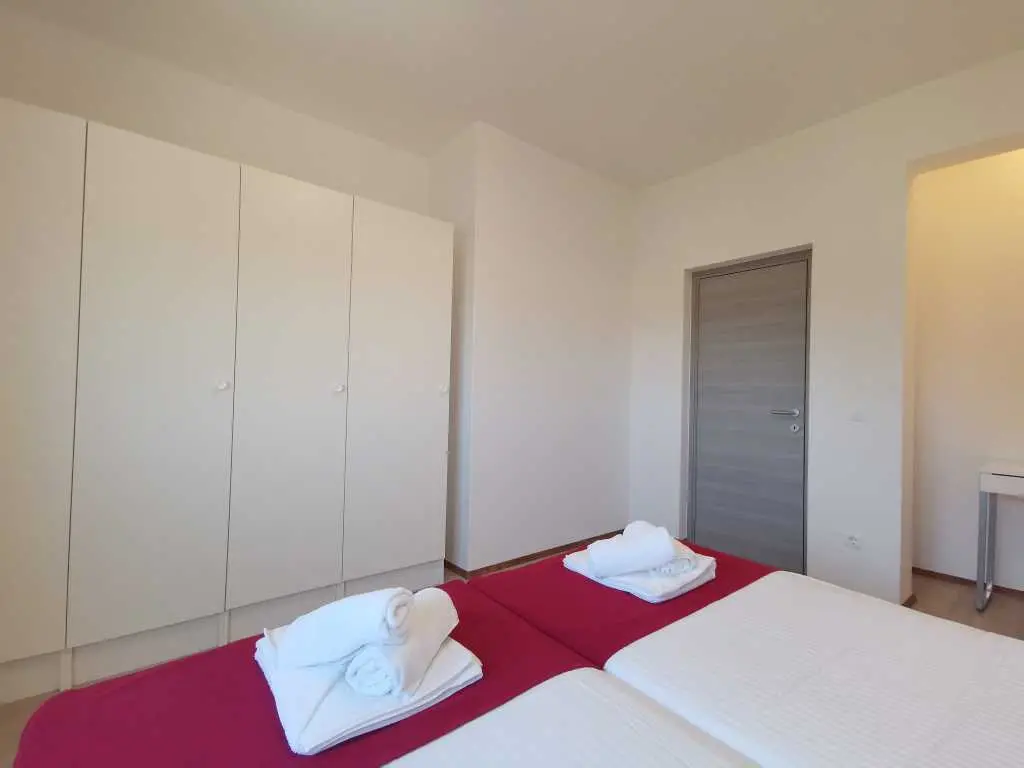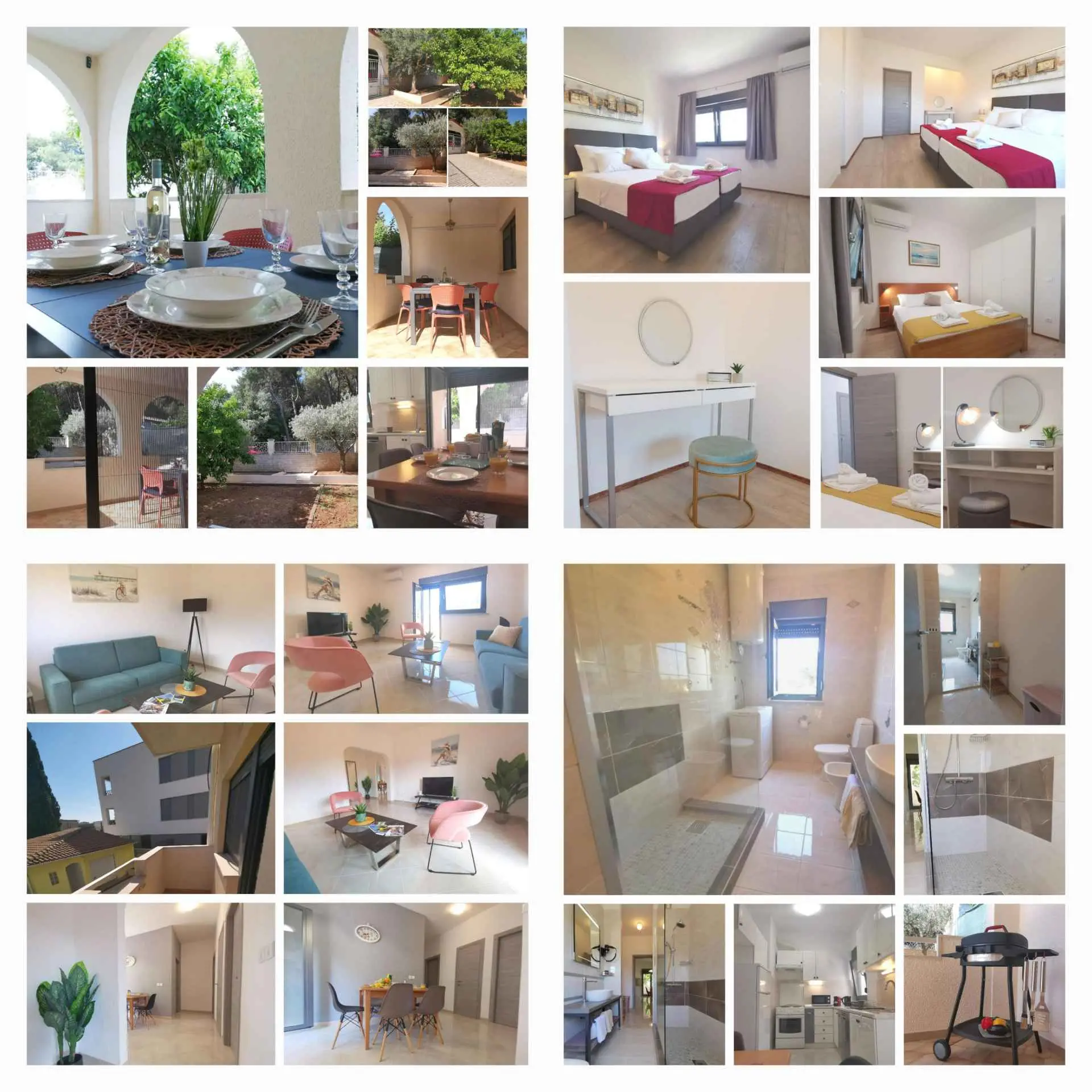 4-hviezdičkový apartmán, novo zariadený, s krásnou terasou s výhľadom na lesy, kde si môžete vychutnať raňajky, obed alebo kávu. Nachádza sa vo výbornej lokalite v tichej ulici a zároveň v tesnej blízkosti mesta (do mesta 2 minúty autom alebo 10 minút pešo). Byt sa nachádza v súkromnom dome, na prízemí. Má cca 100m2, obsahuje veľkú obývaciu izbu (rozkladací gauč 160*190), 2 spálne (1 lôžko 180*200, 1 lôžko 160*190), jedáleň, kúpeľňu (s priestranným sprchovým kútom), WC, chodbu, balkón a veľká terasa s výhľadom na lesík. Byt je vybavený moskytiérou, wifi zdarma, klimatizáciou v obývačke, TV s plochou obrazovkou, práčkou, žehličkou, chladničkou, umývačkou riadu, kávovarom, rýchlovarnou kanvicou, mikrovlnnou rúrou, rúrou, hriankovačom, fénom na vlasy, trezorom na cennosti a bezpečný na kľúče. Okrem iného je byt vybavený úplne novou posteľnou bielizňou, uterákmi a riadom. Aréna Pula je vzdialená 1,3 km a Kaštel Pula 1,4 km. Tiež veľmi blízko (0,500 km -1 km) sa nachádza trh so zeleninou, nemocnica, nákupné centrum Pula City Mall (McDonalds), Lidl, Plodine, Interspar a čerpacia stanica. Odporúčame výbornú pizzeriu Peperoncino, ktorá sa nachádza veľmi blízko a reštauráciu Alighieri v centre mesta. Každému z našich hostí dávame vodu, džús, víno, kávu, čaj, čistiace a hygienické prostriedky. Parkovanie je bezplatné a nachádza sa pred domom. Tešíme sa na váš príchod!