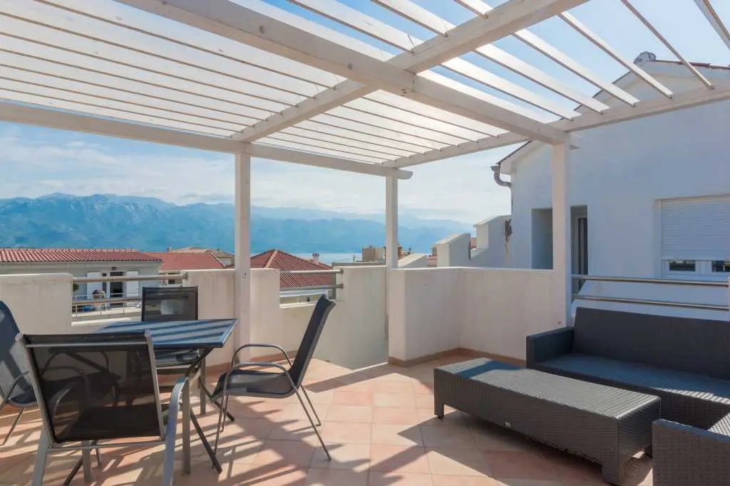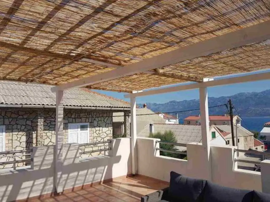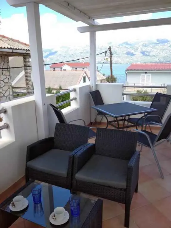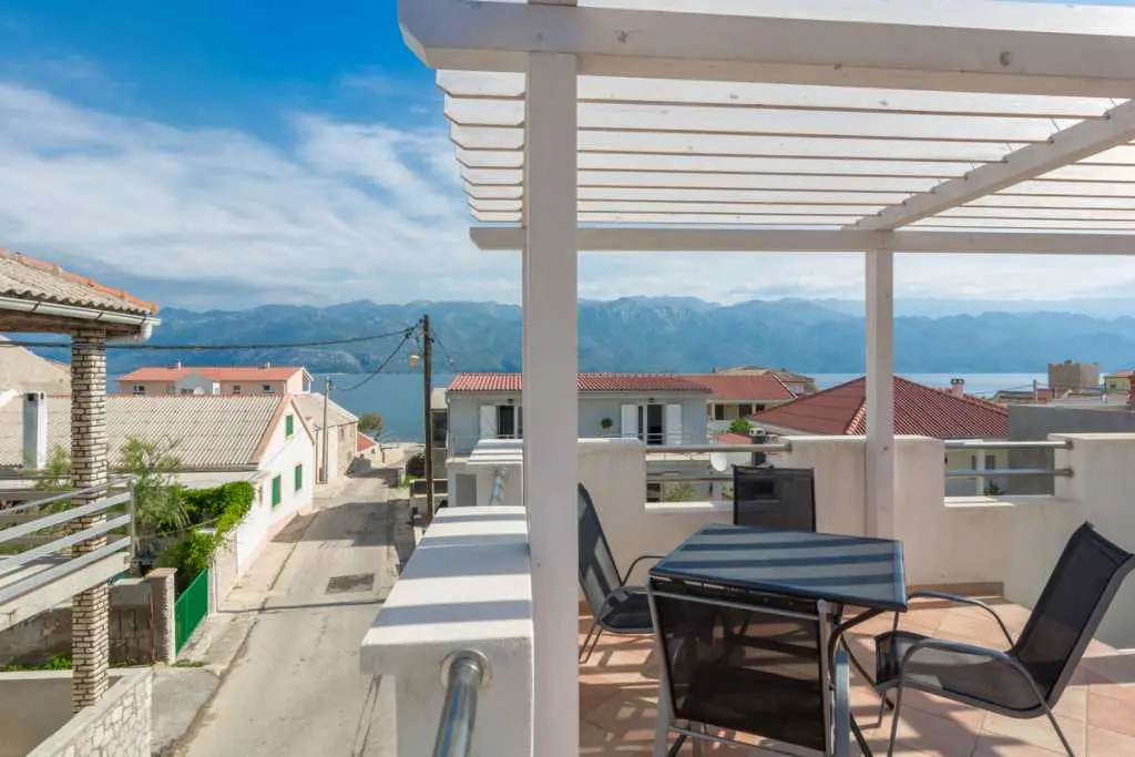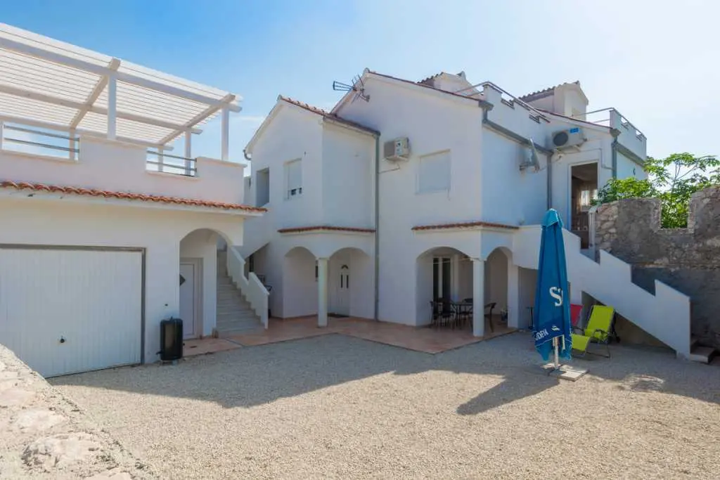 V apartmáne s rozlohou 65 m² sa môže ubytovať šesť osôb. Má prvé poschodie a podkrovie. Na prvom poschodí je obývacia izba s novou kuchyňou, priestranná kúpeľňa a hlavná spálňa. V obývacej izbe je jedálenský stôl pre šesť osôb, LED TV (82 cm) so satelitom a roztiahnutá rozkladacia pohovka pre dve osoby (160 x 200 cm). V apartmáne sú 2 klimatizačné jednotky, jedna v obývacej izbe a druhá v spálni na poschodí. Kuchyňa je kompletne vybavená sporákom, rúrou, chladničkou, kávovarom, mikrovlnnou rúrou a rýchlovarnou kanvicou. Kúpeľňa je vybavená sprchovacím kútom. Hlavná spálňa je vybavená šatníkovou skriňou a manželskou posteľou (180 x 200 cm) s dvoma nočnými stolíkmi. Hlavná spálňa má strešné okno (strešné okno by mohlo byť zatienené). Moderné schody z dreva a ocele vedú na horné podkrovné poschodie, kde sa nachádza druhá spálňa s manželskou posteľou (150 x 200 cm) a druhé WC. Spálňa na hornom poschodí má zariadený balkón orientovaný na juh s nádherným výhľadom na dedinu. Apartmán je vybavený prenosnou posteľou a vysokou stoličkou pre menšie deti. Stránka je oplotená a poskytuje bezpečie pre deti aj pre domáce zvieratá. Stredne veľký pes je povolený. Brána v predzáhradke nie je zamknutá, ale je možné ju zavrieť. Počas hry by však mali byť deti vždy pod dohľadom. K apartmánu patrí spoločné parkovisko, 30 metrov od dvora. K dispozícii je tiež veľká terasa zdieľaná s druhým apartmánom. Je zariadený záhradným nábytkom, slnečníkom a prenosným grilom. Terasa ponúka krásny výhľad na more a pohorie Velebit. K dispozícii je solárne vyhrievaná vonkajšia sprcha s teplou vodou. Prístup na internet je k dispozícii v celom apartmáne a na záhrade.