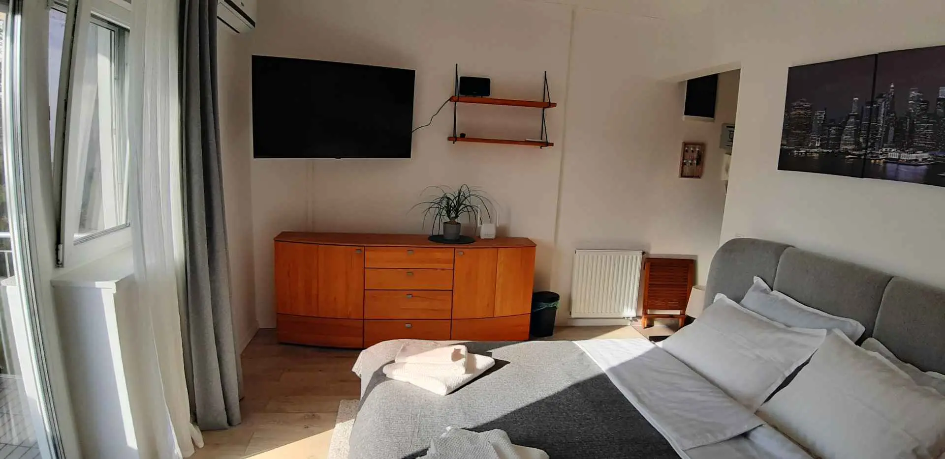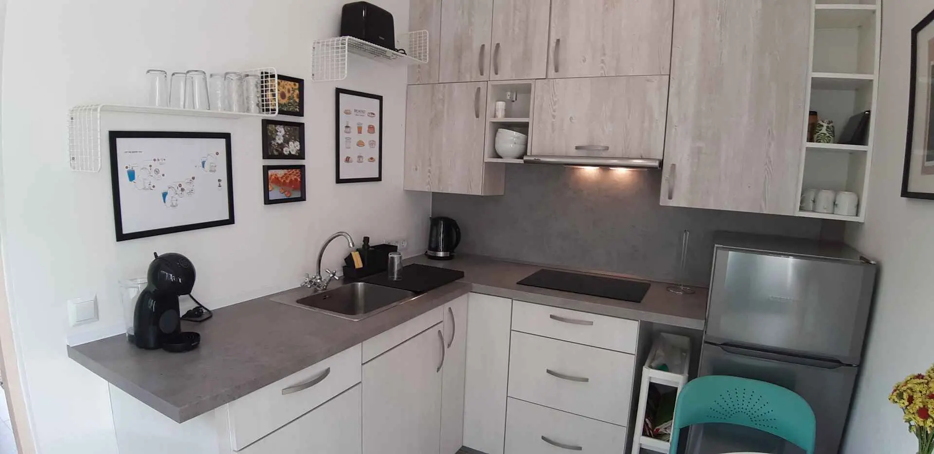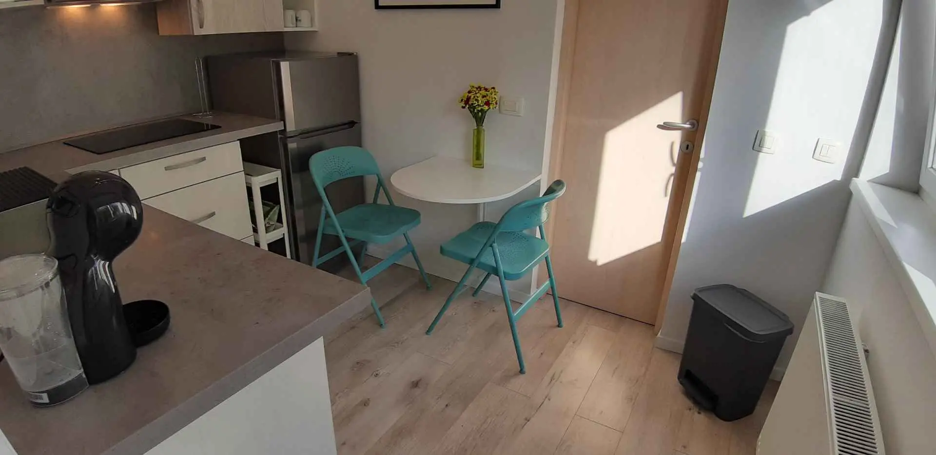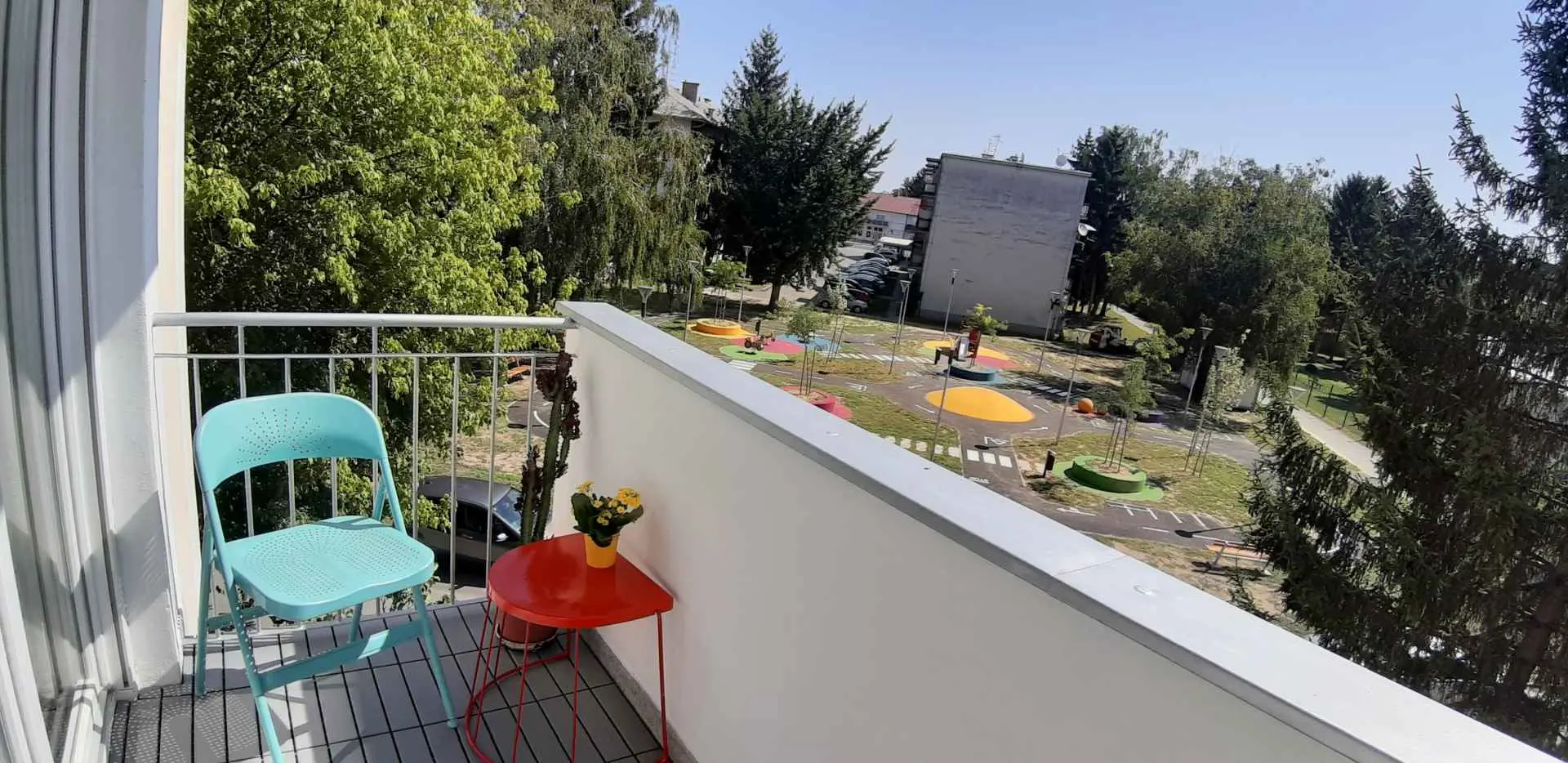 Špecialitou garsónky je, že je orientovaná na východ a juh, takže je takmer celý deň slnečná, čo spríjemňuje pobyt v zime. Balkón je s výhľadom na budovu materskej školy a napriek okolitej zástavbe sa nemusia zaťahovať závesy, v ateliéri je veľké súkromie. Oficiálne sa síce nachádza na Námestí, ale v skutočnosti je v slepej uličke, jedinou premávkou motorových vozidiel sú obyvatelia okolitej zástavby, takže najmä v noci je to oáza pokoja. Ak ráno necháte otvorené okno, zobudí vás spev vtákov. Na druhej strane je od centra mesta (hradu) vzdialený vzdušnou čiarou 250 m, takže všetka občianska vybavenosť vo Virovitici je ľahko dostupná.